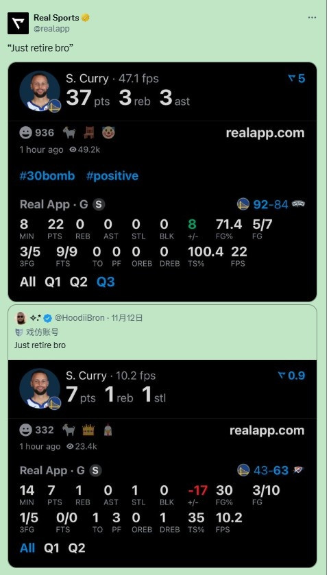"Về hưu nhanh đi anh ơi!" Trước đó, American Curry đã đăng tải thống kê trong hiệp một của Curry với Thunder (trong 14 phút, anh thực hiện 3 trong 10 cú sút, 1 trong 5 quả ba điểm, chỉ ghi 7 điểm, 1 rebound và 1 cướp, đồng thời có 3 lần phạm lỗi với điểm cộng -17) và viết.